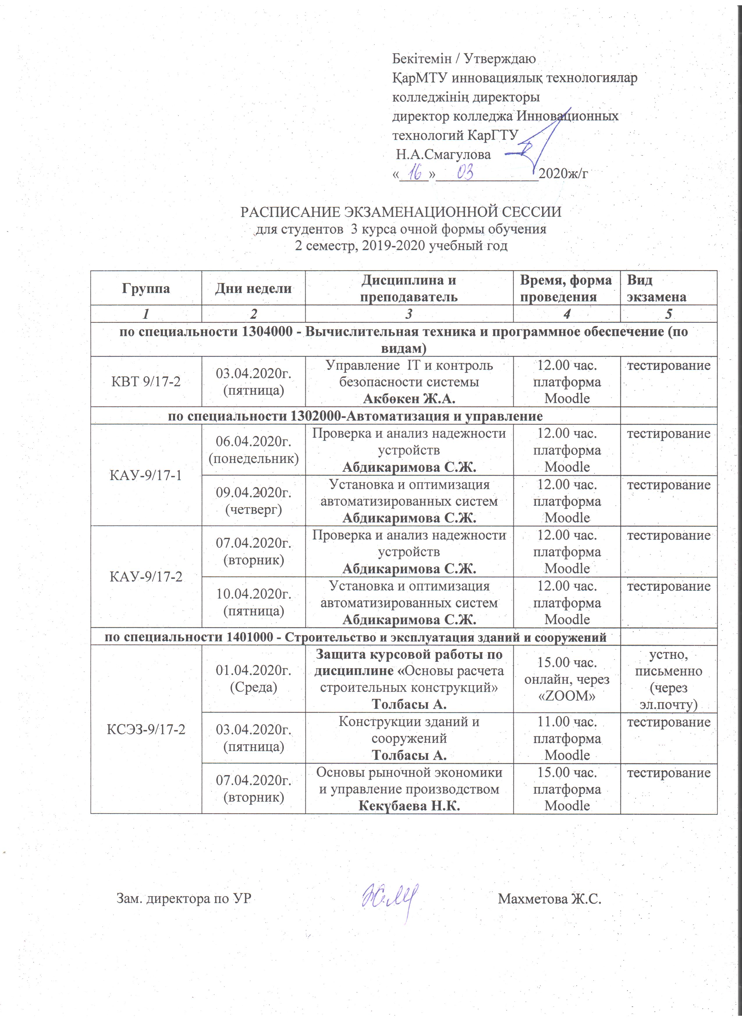 Расписание экзаменационной сессии КИТ КарТУ 2019-2020 учебный год