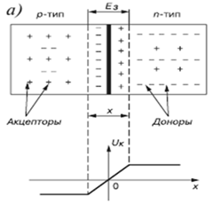 При этом возникает так называемый запирающий (барьерный) слой в несколько микрометров, лишенный носителей заряда, с напряженностью Eз электрического поля, которая препятствует диффузии носителей заряда.