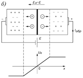 Если к p-n-переходу приложить обратное напряжение, то создаваемая им напряженность E электрического поля повышает потенциальный барьер и препятствует переходу электронов из n-области в p-область и дырок из p-области в n-область.