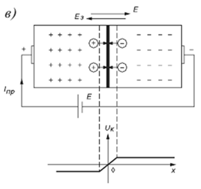 Если включить внешний источник энергии Е, как это показано на рисунке, то создаваемая им напряженность электрического поля будет противоположной направлению напряженности Ез объёмного заряда, и в область раздела полупроводников будет инжектироваться все большее количество дырок (являющимися неосновными для n-области носителями заряда), которые и образуют прямой ток Iпр. При напряжении 0,3...0,5 В запирающий слой исчезнет, и ток Iпр определяется только сопротивлением полупроводника