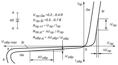 Анализ типовых ВАХ диодов показывает, что прямое напряжение Uпр на германиевом диоде почти в два раза меньше, чем на кремниевом, при одинаковых значениях прямого тока Iпр, а обратный ток Iобр кремниевого диода значительно меньше обратного тока германиевого при одинаковых обратных напряжениях Uобр. К тому же, германиевый диод начинает проводить ток при ничтожно малом прямом напряжении Uпр, а кремниевый – только при Uпр = 0,4…0,5 В.