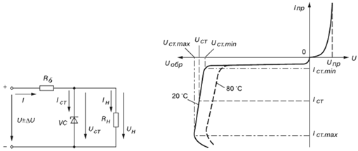 ТКН % = (∆Uст / ∆T)×100 = 0,3…0,4 % / град — температурный коэффициент напряжения на участке стабилизации, характеризующий относительное изменение напряжения стабилизации, вызванное изменением температуры на 1 °С при постоянном токе, протекающем через стабилитрон.