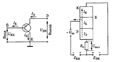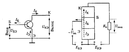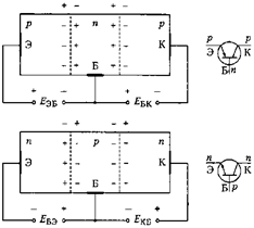 При подключении напряжений к отдельным слоям биполярного транзистора оказывается, что к одному переходу приложено прямое напряжение, к другому - обратное. При этом переход, к которому при нормальном включении приложено прямое напряжение, называют эмиттерным, а соответствующий наружный слой - эмиттером (Э); средний слой называют базой (Б). Второй переход, смещенный приложенным напряжением в обратном направлении, называют коллекторным, а соответствующий наружный слой - коллектором (К).