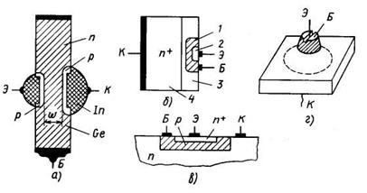 Типовые структуры биполярных транзисторов, изготовленных различными методами, приведены на рисунке.