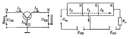 Часть инжектированных в область базы электронов рекомбинируют с основными носителями заряда в этой области (дырками), образуя ток базы IБ. Другая часть инжектированных электронов, которая достигает коллекторного перехода, с помощью электрического поля, создаваемого напряжением UКБ, подвергается экстракции во вторую n-область транзистора - коллектор, образуя через переход коллекторный ток IК.