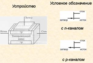 Полевой транзистор, в котором управление осуществляется с помощью изменения обратного напряжения, подаваемого на управляющий p-n-переход, состоит из токопроводящего канала n-типа и двух выводов, которые получили названия исток и сток.