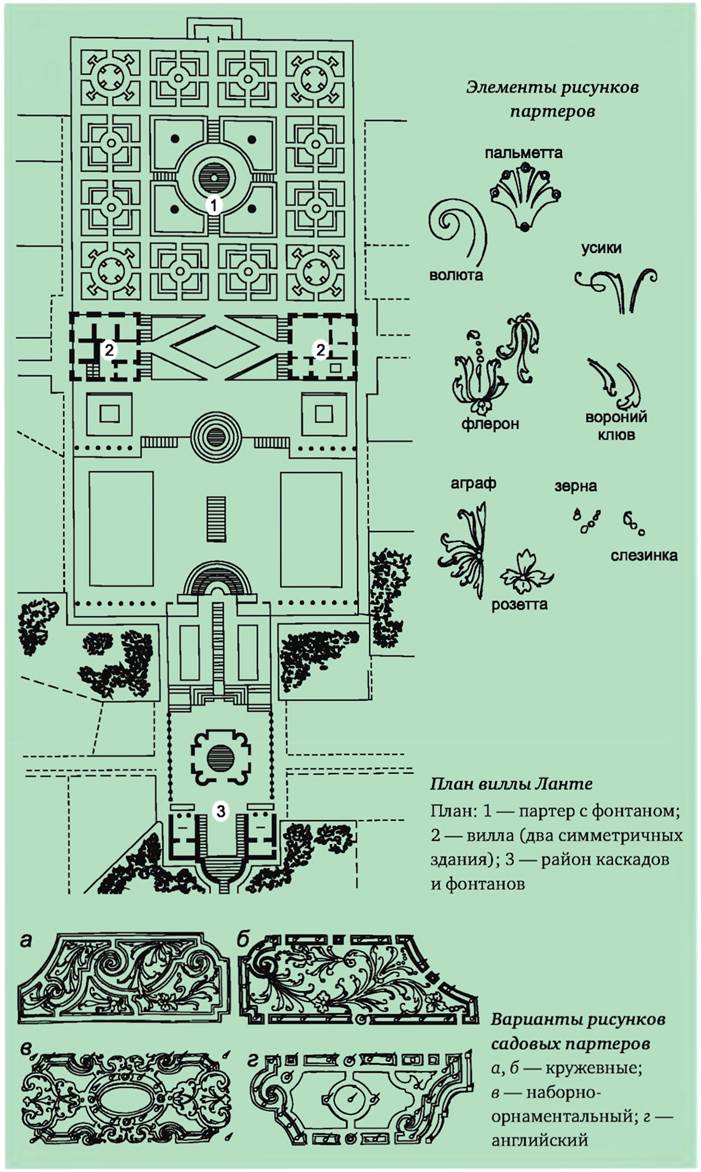 Особенности планировки. В процессе формирования этого стиля можно условно выделить два периода. До конца XVI в. итальянские сады эпохи Возрождения были небольшими по размерам (сад виллы Капрарола – 1 га, виллы Ланте – 1,4 га, виллы Д’ Эсте – 3,5 га) (Кохно Б. И., 1980. С. 21}. Они не были предназначены для прогулок, скорее для отдыха и развлечений на открытом воздухе. Поэтому аллеи того времени являлись всего лишь переходами между отдельными «зелеными комнатами» и проектировались узкими и короткими. Сад имел выраженное осевое построение. Главная ось проходила поперек террас. Перпендикулярно ей направлены поперечные оси. Важные композиционные элементы (архитектурные сооружения, партеры, фонтаны и т. д.) размещались по этим осям, на их пересечении или завершении (Боговая И. О., Фурсова Л.М., 1988. С. 21}. Дворец, как правило, располагался по центральной оси симметрии участка, занимая доминирующее положение. Сады обсаживались густыми деревьями и кустарников, что формировало их визуальную замкнутость, виды на окружающие ландшафты ограничивались определенными точками и направлениями обзора. Террасы заканчивались балюстрадами, что также способствовало эффекту ограничения пространства.