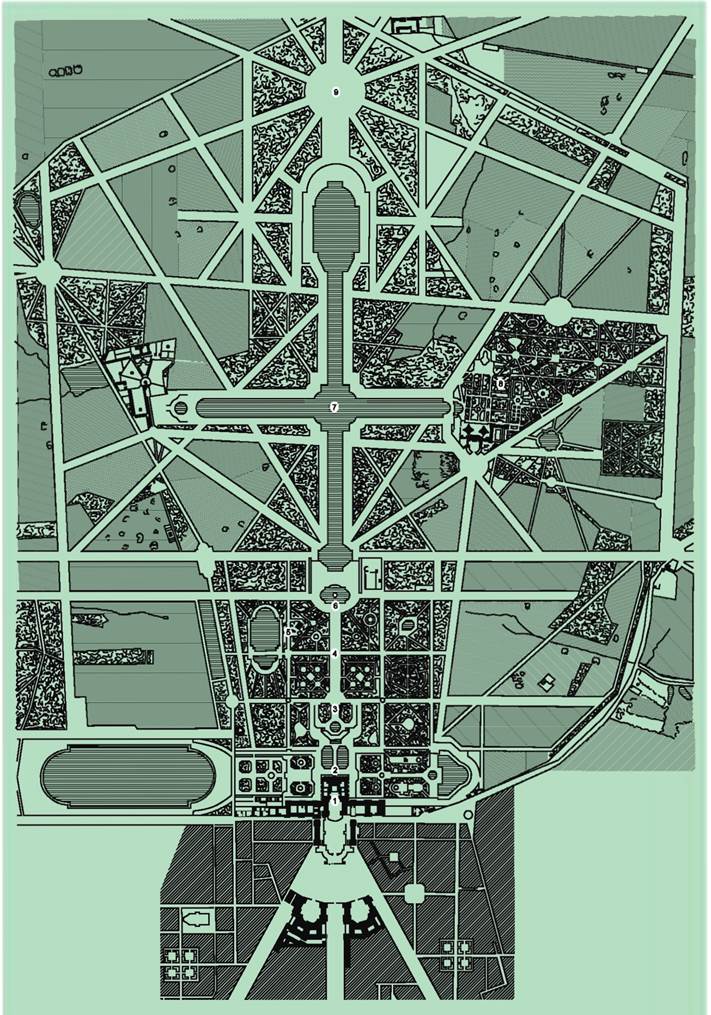 1 –дворец; 2 – водный партер; 3 – бассейн и партер Сатурна; 4 – аллея Зеленого ковра; 5 – Малый парк, район двенадцати боскетов; 6 – бассейн Аполлона; 7 – канал; 8 – Трианон; 9 – королевская площадь