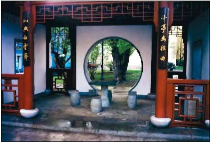 Одним из основных принципов ландшафтного проектирования в Китае является соответствие или даже единение архитектуры и пейзажа, где каждое строение занимает свое уникальное место в садовом комплексе, каждая архитектурная деталь имеет свою меру и ритм, задает свой собственный стиль. Архитектура сводилась большей частью к строгим, не подверженным капризам моды геометрическим структурам. Во многих районах Китая существовал обычай придавать даже дверным проемам форму круга, как бы уравновешивающего прямоугольник самого помещения. Не были редкостью двери в виде восьмиугольника или тыквы- горлянки – знаков космического цикла перемен. Передать связь между внешним и внутренним пространством наилучшим образом удается через окно. Оно всякий раз открывает живописный вид или даже серию видов, представая своего рода «живой картиной». Дом открывается саду, а сад входит в дом.