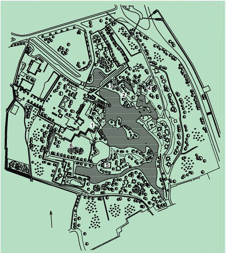 1 – дворец; 2 – кленовая тропа; 3 – холм Клена; 4 – каскад;