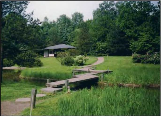 - пейзажность садов – плавные линии крупных водоемов, мягкие формы рельефа, свободно растущая растительность;