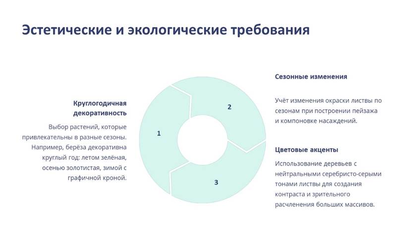 Ассортимент растений подбирается с учётом эстетических и экологических требований. Берёза декоративна круглый год: летом в зелёном наряде, гармонирующем с её атласно-белым стволом, в осеннем золотистом уборе и, наконец, зимой благодаря тонкому графическому рисунку кроны, особенно покрытой инеем в солнечный морозный день.