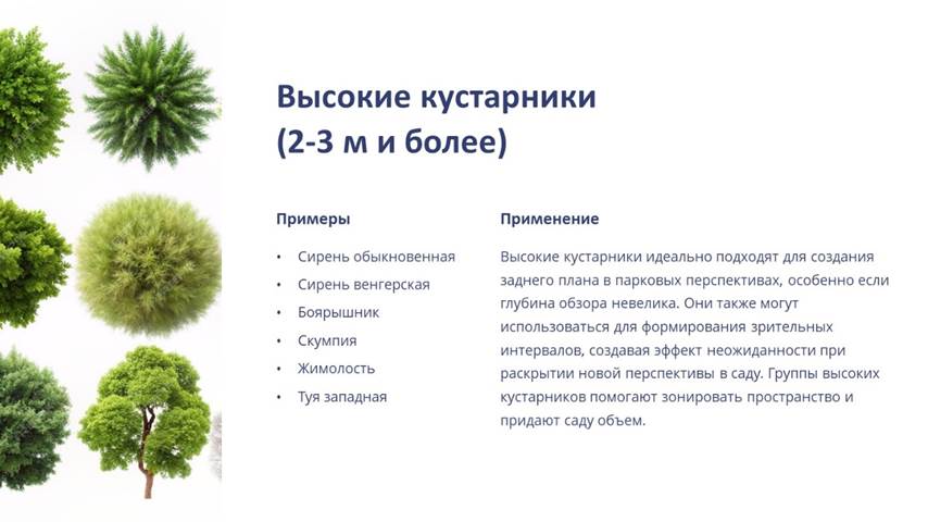 1) высокие кустарники, достигающие 2-3 м и более (сирень обыкновенная и венгерская, боярышник, скумпия, жимолость, туя западная и др.); образуют задний план при небольшой глубине парковой перспективы. Крупные группы высокого кустарника высаживают, чтобы получить зрительный интервал перед раскрытием новой перспективы (так называемый «эффект неожиданности»);