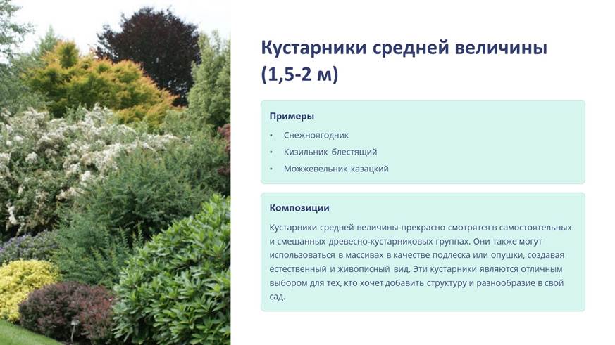 2) средней величины – от 1,5 до 2 м (снежноягодник, кизильник блестящий, можжевельник казацкий и др.); компонуются в самостоятельные и смешанные древесно-кустарниковые группы, используются в массивах в виде подлеска или опушки;