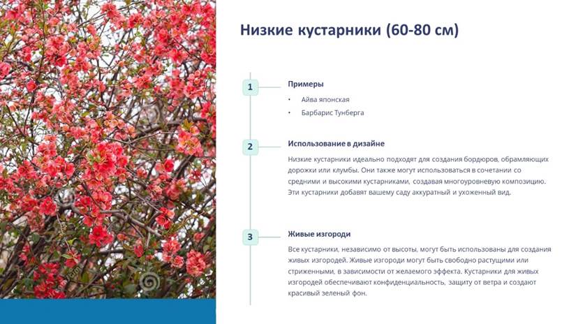 3) низкие – 60-80 см (айва японская, барбарис Тун-берга и др.); используются в виде бордюра, а также в сочетании со средним и высоким кустарниками.