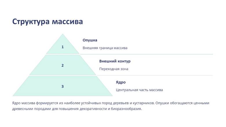 Структура массива – ядро, внешний контур и опушка. Для ядра применяются породы деревьев и кустарников, наиболее устойчивые в данных условиях произрастания. Ассортимент массива обогащается посадкой по опушкам ценных древесных пород.