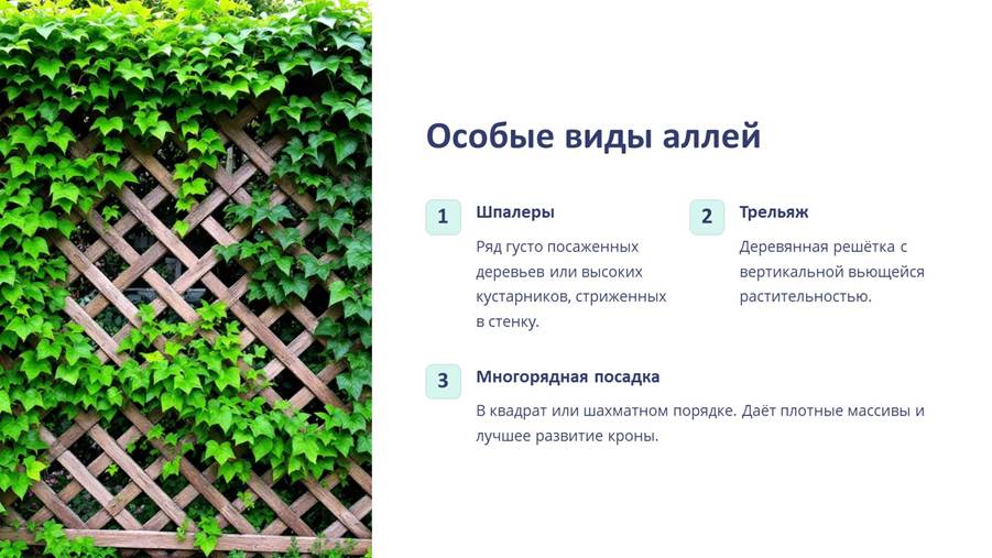Наиболее распространенные виды рядовых посадок – аллеи и живые изгороди.