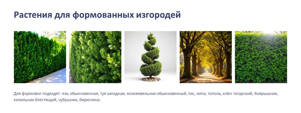 - медленнорастущие (прирост деревьев в высоту до 0,25-0,2 м) лиственные (груши и яблони лесные), хвойные (кедр), кустарники (облепиха, ирга, бирючина и др.).