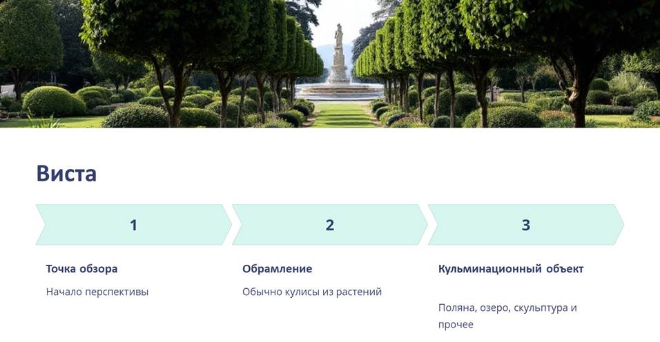 Виста – узкая перспектива, вид, направленный в сторону какого-либо выдающегося элемента ландшафта. Включает точку обзора, обрамление (обычно кулисы из растений) и завершающий кульминационный объект обозрения (поляна, озеро, скульптура и прочее).