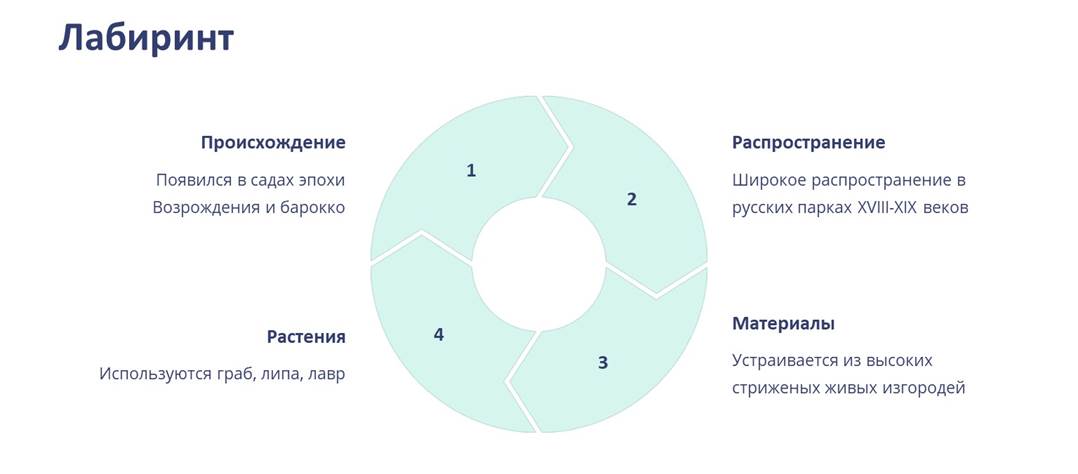 Лабиринт – участок парка или сада со специально запутанными проходами. Появился в садах эпохи Возрождения и барокко, широкое распространение получил в русских парках XVIII-XIX веков. Устраивается из высоких стриженых живых изгородей (с использованием граба, липы, лавра).