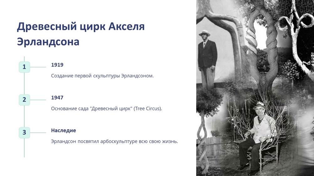 В 1947 г. создание сада «Древесный цирк» (Tree Circus). Эрландсон посвятил арбоскульптуре всю свою жизнь. Сейчас один из самых известных арборскульпторов – Ричард Римс (Richard Reams). Главная идея, которой руководствуется Ричард, – «Представь себе тот мир, в котором хотел бы жить, и сделай его сам». Вот так и получаются самые восхитительные арт-неожиданности – вплоть до домов из растущих деревьев.