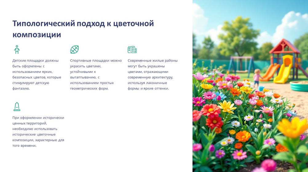 3 подход – типологический, при котором, опираясь на первые два подхода, ведётся поиск индивидуального решения цветочного оформления для каждого типа архитектурно-ландшафтного объекта. Цветочные композиции должны быть различны в детских и спортивных, прогулочных и аттракционных парках; на территориях жилой застройки – современной многоэтажной, малоэтажной с индивидуальными участками или исторически ценной, реконструируемой;