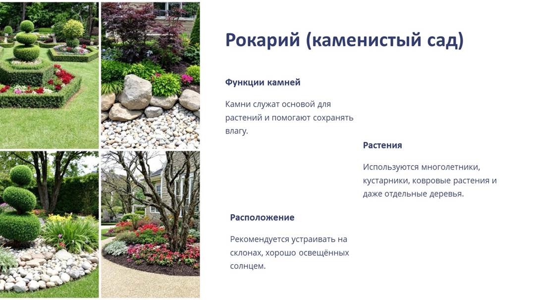 Рокарий, или каменистый сад, – приём декоративного цветочного оформления. Для устройства каменистых садов используют участки с неудобным или нарушенным рельефом (откосы, выходы каменной породы и т. п.). На плоском рельефе большой рокарий будет выглядеть не только искусственным, но и стоить намного дороже, чем на склоне. Декоративная особенность рокария – концентрация на малой площади большого количества разнообразных растений.
