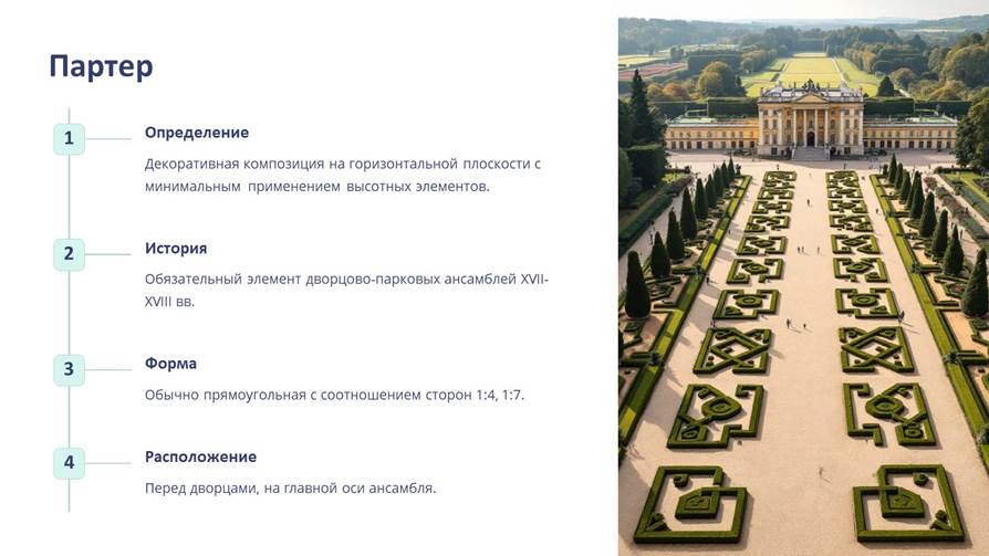 Партер – декоративная композиция на горизонтальной плоскости с минимальным применением высотных элементов (кустарники, скульптура). В XVII-XVIII вв. партеры были обязательным элементом дворцово-парковых ансамблей. Основное требование к партеру – полный охват его взглядом при совпадении продольной оси партера с основной осью обозрения. Обычно партеры имели прямоугольную форму с соотношением сторон 1:4, 1:7. Классические условия построения партера требовали, чтобы он был вытянутой формы, учитывал условия зрительного перспективного сокращения. Середину партера рекомендовалось слегка приподнять для уничтожения оптического впечатления прогиба. Если участок имел значительный уклон, то партер решался в виде двух или более террас, отделённых друг от друга подпорными стенками или переходными откосами.