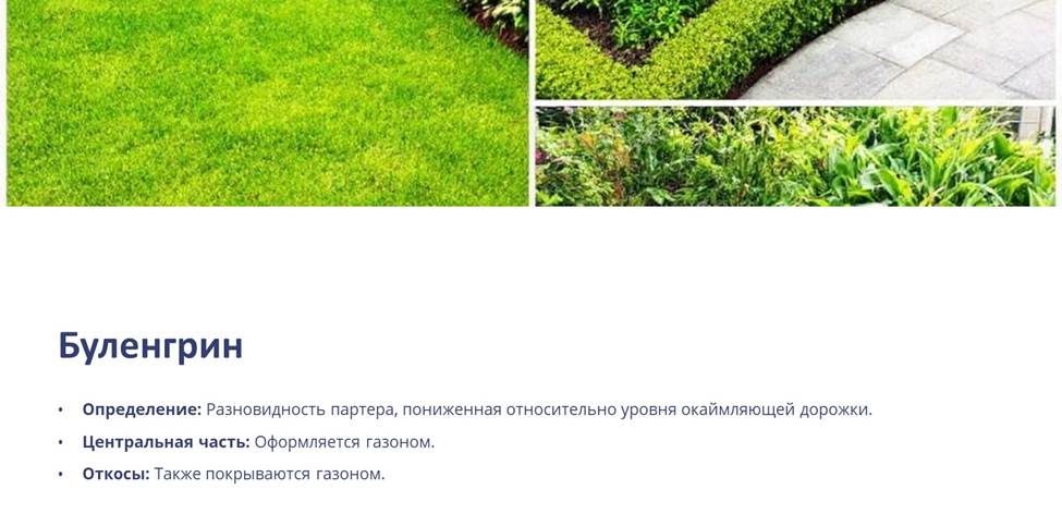 Буленгрин – регулярный участок в парке, который является разновидностью партера, несколько пониженного относительно уровня окаймляющей его дорожки. Центральная часть буленгрина оформляется газоном. Остальное – откосы, также покрываемые газоном.
