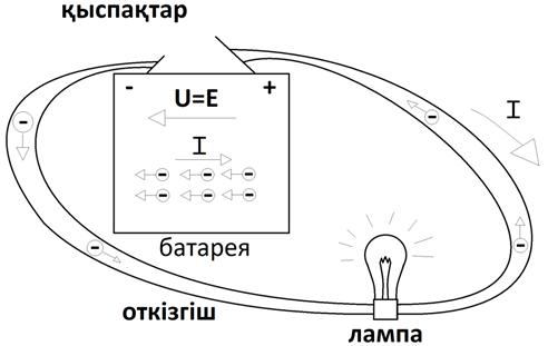 потенциалы төмен қыспақтан (-) потенциалы жоғары қыспаққа (+) бағытталғанда, көзінің