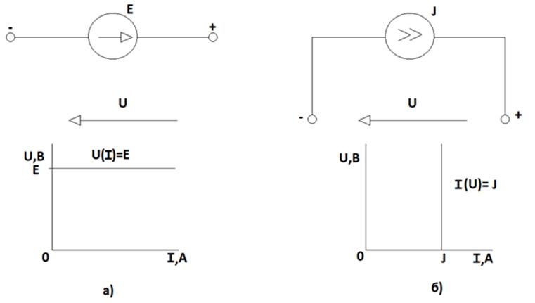 Сур.1.7. ЭҚК (а) және ток (б) көздерінің сұлба мен ВАС
