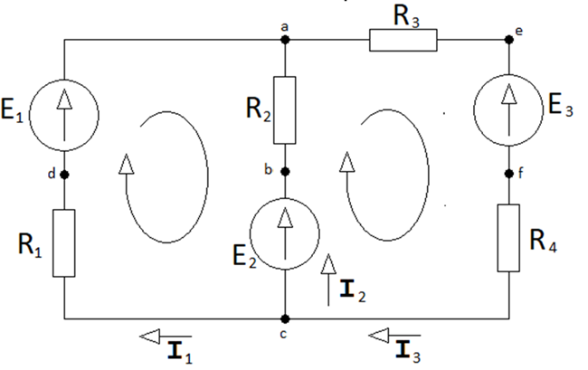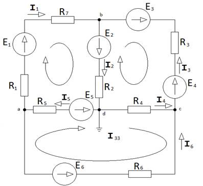 Е11 = E1 + E2 – E5, Е22 = - E2 + E3 – E4, Е33 = E5 – E6 – контурлық ЭҚК, контурды құрайтын тармақтардың ЭҚК-ің алгебралық қосындысымен анықталады.