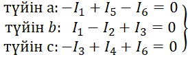 Кирхгофтың бірінші заңы бойынша жазылатын теңдеулердің саны N1 тәуелсіз түйіндер санына тең. Берілген схема бойынша, әдетте, бір түйін базис түйіні ретінде таңдалады (сур. 3.1 схемасында базис ретінде түйін d жерге қосылған, φd =0). Сондықтан тәуелсіз түйіндердің саны жалпы түйіннің санынан бірге кем, яғни N1 = nу – 1. Сур. 3.1 схема бойынша N1 = 4–1=3 тәуелсіз теңдеулер жазылады.