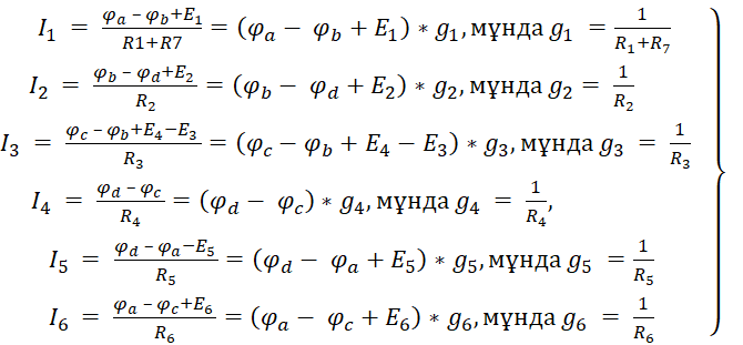 Ja = - E1*g1 – E5 *g5 – E6 * g6, Jb = E1*g1 – E2 *g2 +(E4– E3) * g3, Jc =(E2– E4) * g3+ E6 * g6 – түйіндік токтары деп аталады. Бұл токтын қосындысы E*g «+» таңбамен алынады, егер ЭҚК түйінге кіретін болса; шығатын болса E*g «-» таңбамен алынады.