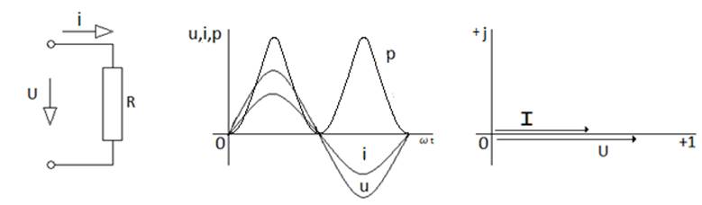 Сур. 5.1. Резистор (а); кернеу, ток, қуат графигі (б); векторлық диаграмма (в)