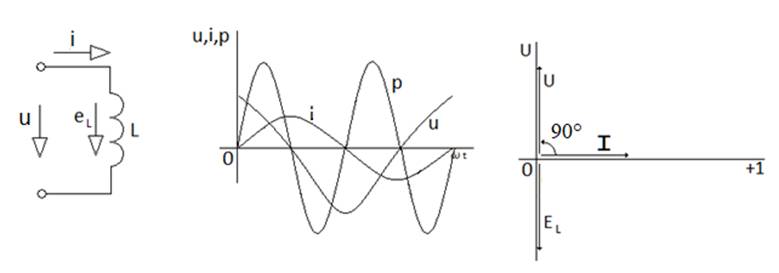 Сур. 5.6. Индуктивтілік (а); кернеу, ток, қуат графигі (б); векторлық диаграмма (в)