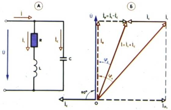 5.9-сурет. Конденсатор мен активті кедергісі және индуктивтілігі бар тармақтың параллель қосылуы
