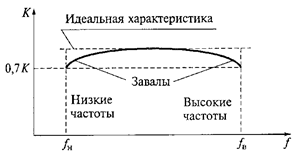 Частотная характеристика усилителя - это зависимость модуля коэффициента усиления по напряжению К от частоты f (рисунок 3.9). Идеальная характеристика - горизонтальная в диапазоне частот fн...fв, который называют полосой пропускания усилителя. Реальная характеристика имеет завалы, которые вызываются влиянием реактивных элементов главным образом в цепях межкаскадной связи.