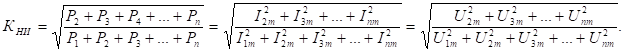 Коэффициент нелинейных искажений определяется корнем квадратным из отношения мощностей всех высших гармоник выходного сигнала, появляющихся в результате нелинейных искажений, к полной выходной мощности: