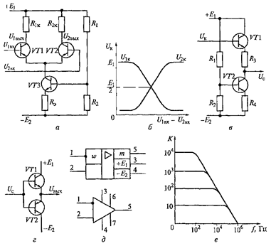 а - электрическая схема, 6 - переключательная характеристика; в - каскад со смещением постоянного уровня напряжения, г - двухтактный усилитель мощности, д - графическое обозначение операционного усилителя: 1 - инвертирующий вход; 2 - неинвертирующий вход; 3 - подключение «положительного» источника питания, 4 - подключение «отрицательного» источника питания; 5 - выходной сигнал, 6, 7 - подключение цепей; е - АЧХ операционного усилителя