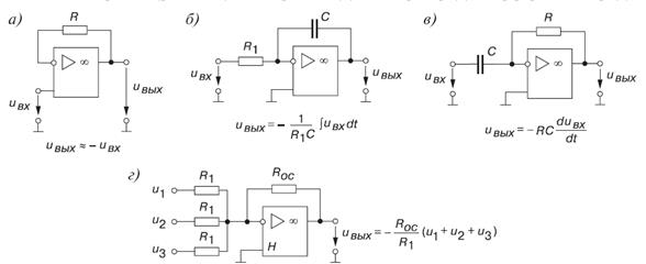 На основе операционных усилителей строят функциональные узлы, предназначенные для выполнения математических операций (рисунок 3.16): повторитель (а), интегратор (б), дифференциатор (в), сумматор (г) и другие.