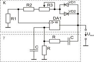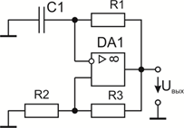 ПОС выполнена на основе резистивного делителя R2, R3 (триггер Шмитта) и цепь ООС содержит пассивный интегратор R1, С1.