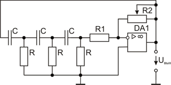 В рассматриваемой схеме самая чистая синусоида имеется на выходе третьего RС-звена. Этот выход высокоомный, и вход следующего каскада должен также иметь высокое входное сопротивление для предупреждения сдвига частоты генерации при изменении этой нагрузки.